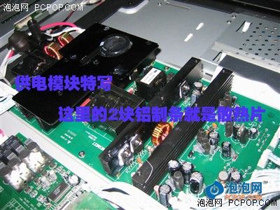 这里就是供电模块的位置了,也是存有高压的地方。小编是经过了一个小时的放电时间才敢打开后盖,这个供电模块还配有了2条散热片,可以有效的对电路板的位置进行散热,以保证电视的正常工作。