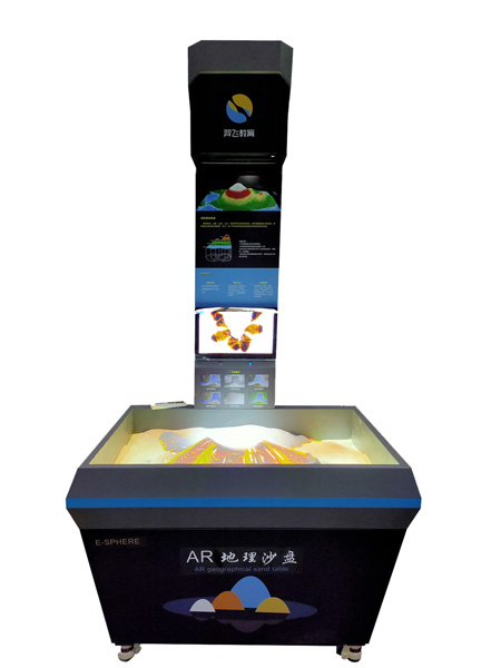 以高性能专用XR一体计算机和相关动捕感应装置、显示装置构成,实现裸眼XR效果;系统内置丰富的地形地貌、地质漫游等课程内容,同时具有增强现实功能,支持老师、学生和3D互动,实现在教室就能沉浸式体验在溶洞、在冰川、在太空等场景效果。