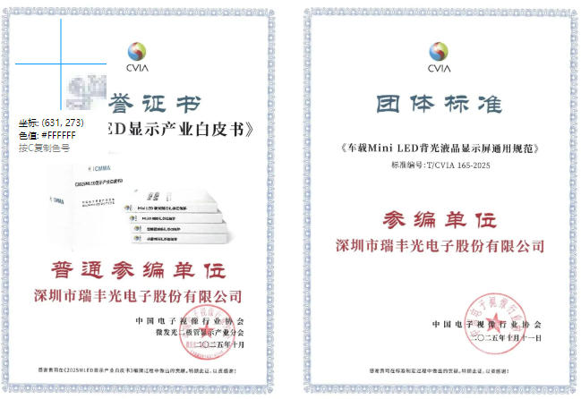 近年来,瑞丰光电以自身在Mini LED背光领域的深度洞察与技术积淀,此次参编《2025 MLED 显示产业白皮书》、《车载 Mini LED 背光液晶显示屏通用规范》团体标准,不仅是行业对其Mini LED技术实力与市场地位的高度认可,更是其长期以来坚持技术创新、积极参与产业生态建设的直接体现。
