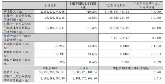 营收方面:本报告期(单三季度)营收 22.68 亿元,同比下降 19.22%;年初至报告期末(1-9 月)营收 64.89 亿元,同比下降 16.20%,主要系行业周期性调整影响。