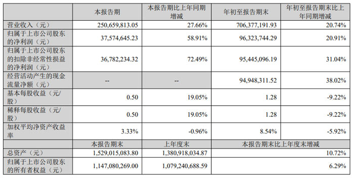 本报告期(单三季度)公司实现营业收入 8.90 亿元,较上年同期增长 25.37%;年初至报告期末累计营收达 22.71 亿元,同比增长 24.04%,增长动力主要来自订单量的稳步增加。