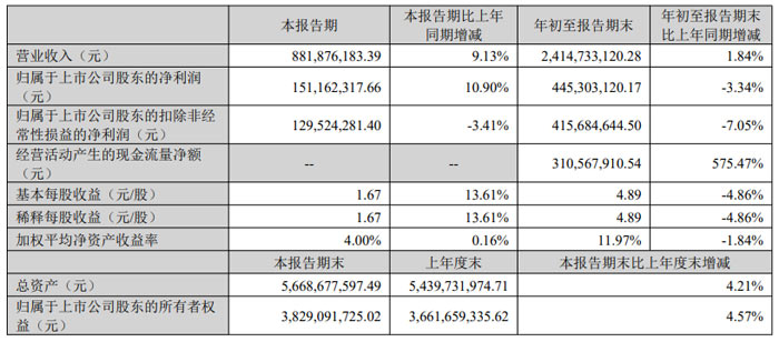 2025 年 1-9 月,公司累计实现营业收入 28.09 亿元,同比下降 11.04%;归属于上市公司股东的净利润 3.14 亿元,同比减少 40.51%;扣非后净利润 3.66 亿元,同比下降 27.55%。基本每股收益与稀释每股收益均为 0.7624 元 / 股,同比降幅达 45.16%;加权平均净资产收益率 8.67%,较上年同期减少 14.62 个百分点。报告指出,净利润同比下降主要系主营业务毛利率较上年同期略有调整所致。