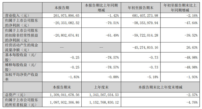 年初至报告期末表现:1-9 月累计实现营业收入 5.50 亿元,同比减少 11.64%;归属于上市公司股东的净利润为 - 110.38 万元,同比下降 119.64%;扣非后净利润为 - 634.31 万元,同比降幅扩大至 1020.52%。