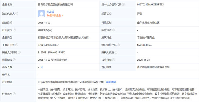 近日,歌尔股份全资子公司青岛歌尔星启智能科技有限公司正式成立,注册资本达 2 亿元人民币,注册日期为2025年11月3日,法人代表为李友波。该公司经营范围精准覆盖虚拟现实设备制造、可穿戴智能设备制造、智能家庭消费设备制造等核心领域,成为歌尔股份深化 AR/VR 产业链布局的又一重要载体。