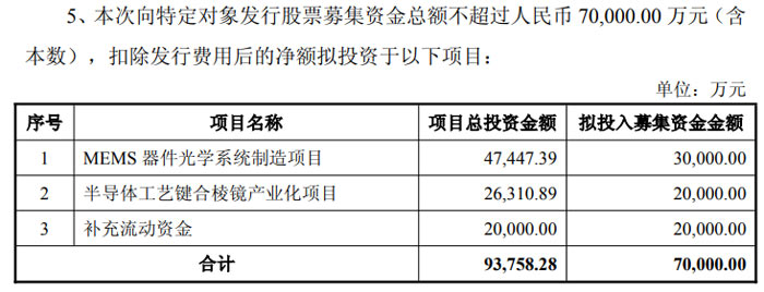 本次募集资金总额不超过 7 亿元,扣除发行费用后将按规划投入三大方向,其中 3 亿元用于 MEMS 器件光学系统制造项目,2 亿元投向半导体工艺键合棱镜产业化项目,2 亿元用于补充流动资金,项目总投资合计 9.38 亿元。