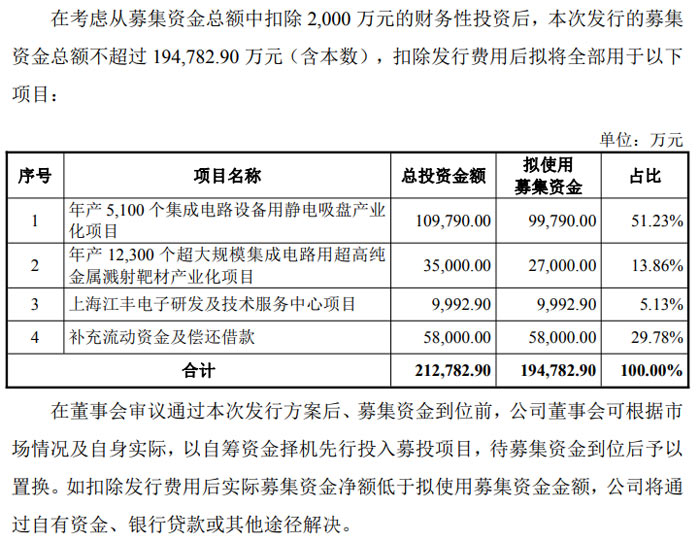 年产 5,100 个集成电路设备用静电吸盘产业化项目:总投资 109,790 万元,拟使用募资 99,790 万元,由全资子公司宁波晶磐、北京江丰实施。静电吸盘作为半导体设备核心耗材,国产化率不足 10%,项目将突破关键技术瓶颈,填补国内空白,达产后预计税后内部收益率 35.07%。