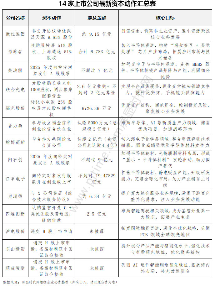 随着 2025 年步入尾声,半导体与光学显示领域的资本热潮却持续升温。12月初,康佳、探路者、美迪凯、联合光电、福光股份、合力泰、翰博高新、阿石创、江丰电子、 奥瑞德、四维图新、沪电股份、东山精密、领益智造14家上市公司密集发布重磅资本公告,涵盖股权转让、跨界收购、定向募资、产业基金设立等多元运作,共同勾勒出中国半导体显示产业加速整合、向上突围的战略图景,彰显产业在 AI 算力爆发与显示技术迭代背景下的蓬勃活力。