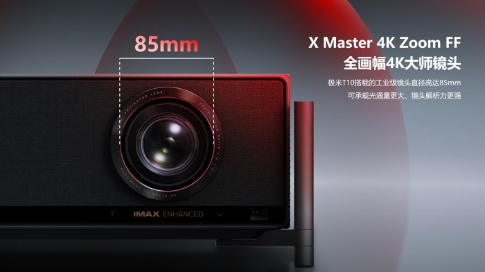 T10配备了85mm的X Master 4K Zoom FF全画幅大师镜头、1.2-1.8:1的投射比搭配1.5倍光学变焦、±100%垂直、±40%水平的智能光学移轴功能,让光学应用更灵活、画质也更清晰透亮。