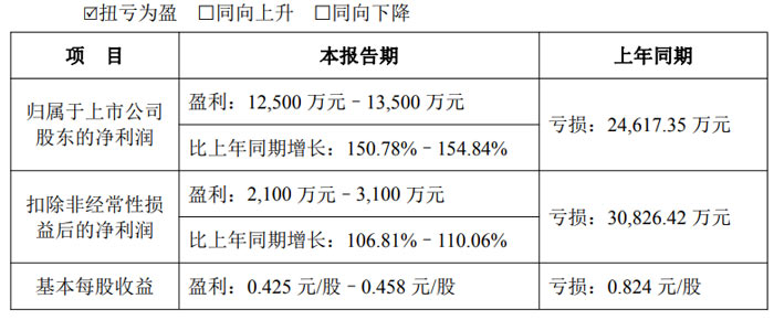 业绩数据方面,公司归属于上市公司股东的净利润预计盈利 12,500 万元至 13,500 万元,上年同期为亏损 24,617.35 万元,同比增长 150.78% 至 154.84%;扣除非经常性损益后的净利润预计盈利 2,100 万元至 3,100 万元,上年同期为亏损 30,826.42 万元,同比增长 106.81% 至 110.06%;基本每股收益预计盈利 0.425 元 / 股至 0.458 元 / 股,上年同期为亏损 0.824 元 / 股。