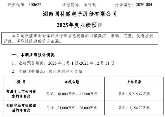 2026 年 1 月 26 日,湖南国科微电子股份有限公司(证券代码:300672,证券简称:国科微)发布 2025 年度业绩预告(公告编号:2026-004),公司本期业绩预计呈现亏损状态。其中,归属于上市公司股东的净利润预计亏损 18,000 万元至 25,000 万元,而上年同期该指标为盈利 9,715.47 万元;扣除非经常性损益后的净利润预计亏损 21,000 万元至 28,000 万元,上年同期则为盈利 1,154.72 万元。