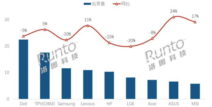 Samsung(三星)的出货量为11.6M台,位居第三,同比下滑10%。由于市场布局主要依赖欧美,下半年海外需求降温直接导致订单缩减。同时,其在中国消费端布局相对较弱,加之电竞高端赛道面对ASUS、MSI的强势竞争,份额被分流,双重因素共同影响了整体出货量。