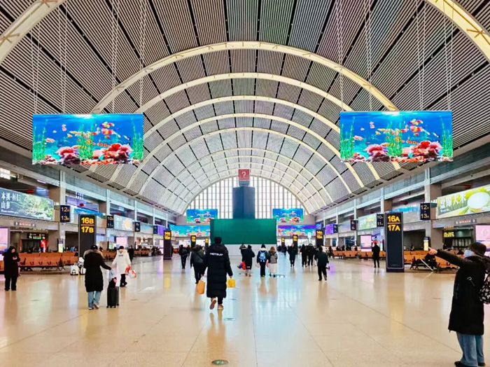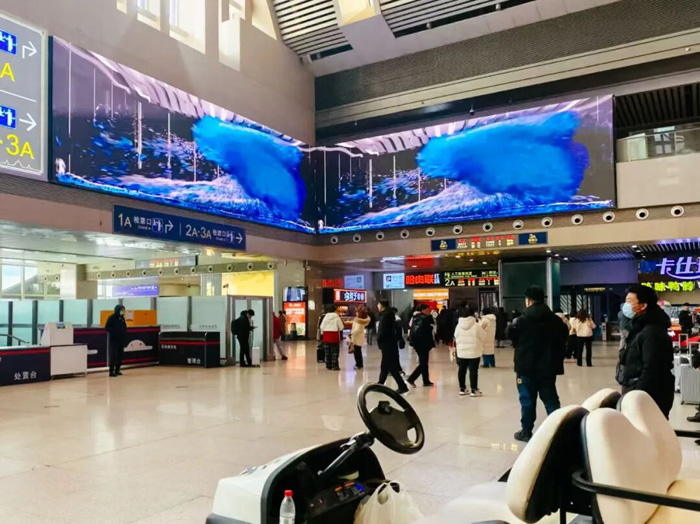 当您穿过大厅,来到检票口。这里是登车的必经之地,也是人流最密集之处。沈阳站部署了两组洲明的巨型LED直角屏。细腻的色彩流转,既能清晰展示公共导引信息,又能放映品牌广告或3D数字内容,营造活泼温润的氛围,消解了排队时的枯燥感。