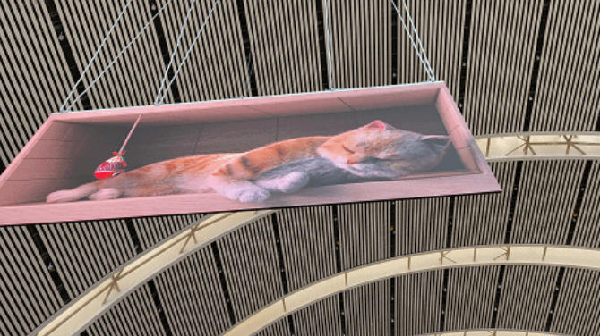 这里也是洲明独创虚拟IP“大橘”的新家。屏幕中,憨态可掬的橘猫正追逐着玩具,尾巴轻扫,玩具仿佛要跃出屏幕......裸眼3D的视觉效果逼真灵动,希望这只“大橘”能让许多赶路的旅客会心一笑,卸下路途的疲惫。