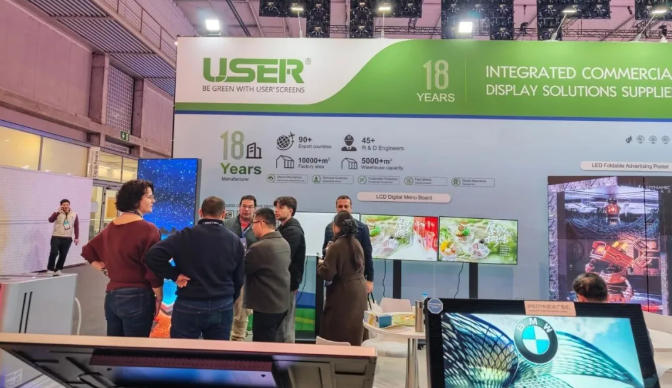其中,LED共阴节能箱体凭借四级节能技术,功耗较传统产品降低20%以上,屏体温度平均降低14.6℃,搭配IP65防护等级与全金属自然散热设计,适配户外复杂环境,同时具备3840Hz高刷新率与8000:1高对比度,画面呈现细腻稳定;4折叠LED海报屏、折叠款LED海报屏无需复杂安装,插电即可使用,支持单屏显示与拼接组合,防水防潮且色彩还原度高,适配多元展示场景;IP67户外防水广告机、43寸户外双面立式广告机等户外系列产品,具备超强耐候性,可应对宽温、多雨等极端户外环境,搭配高亮度显示面板,实现阳光下清晰可视;15.6寸/10.4寸工控一体机则可作为工业物联网核心设备,实现数据采集、故障诊断与本地智能分析,适配智慧工厂等工业场景,多款产品凭借差异化优势获得欧洲参展商的广泛关注。