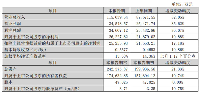 财务状况上,报告期末公司总资产达 24.26 亿元,较期初 19.99 亿元增长 21.33%;归属于上市公司股东的所有者权益 17.46 亿元,较期初 15.77 亿元增长 10.74%。公司股本保持稳定,仍为 4.70 亿元,归属于上市公司股东每股净资产 3.71 元 / 股,较期初 3.35 元 / 股增长 10.75%。